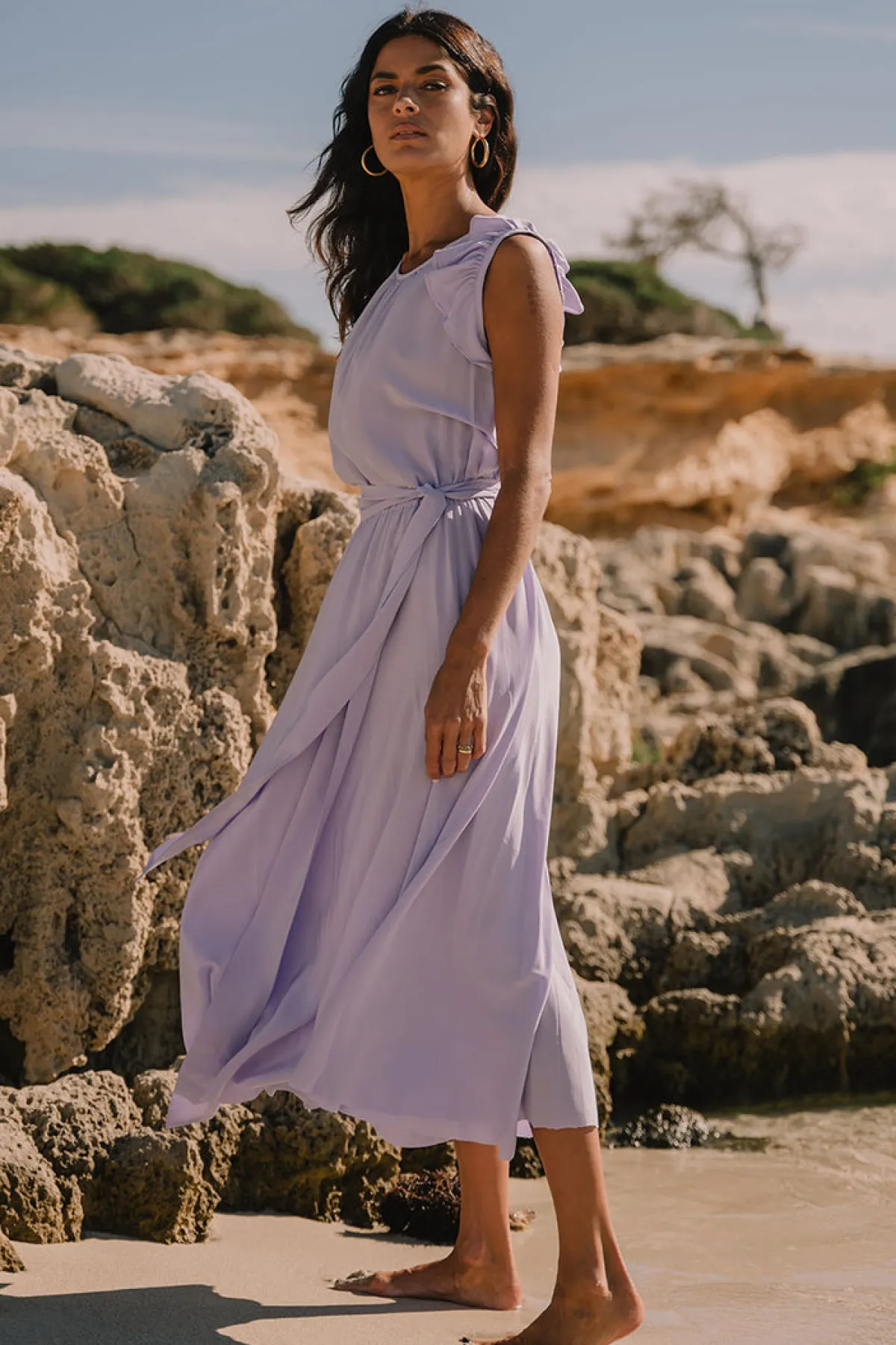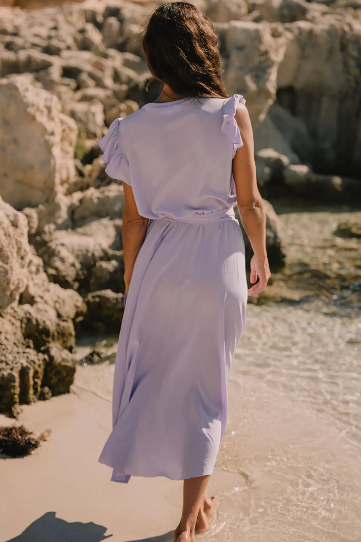 Tea-length semi-circle dress with round and ruffled sleeves with elasticized waist. Slips on, unlined with French sea…
