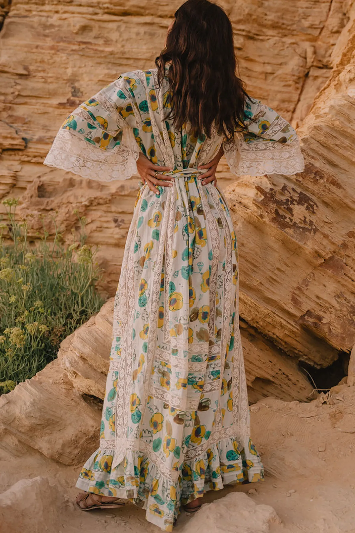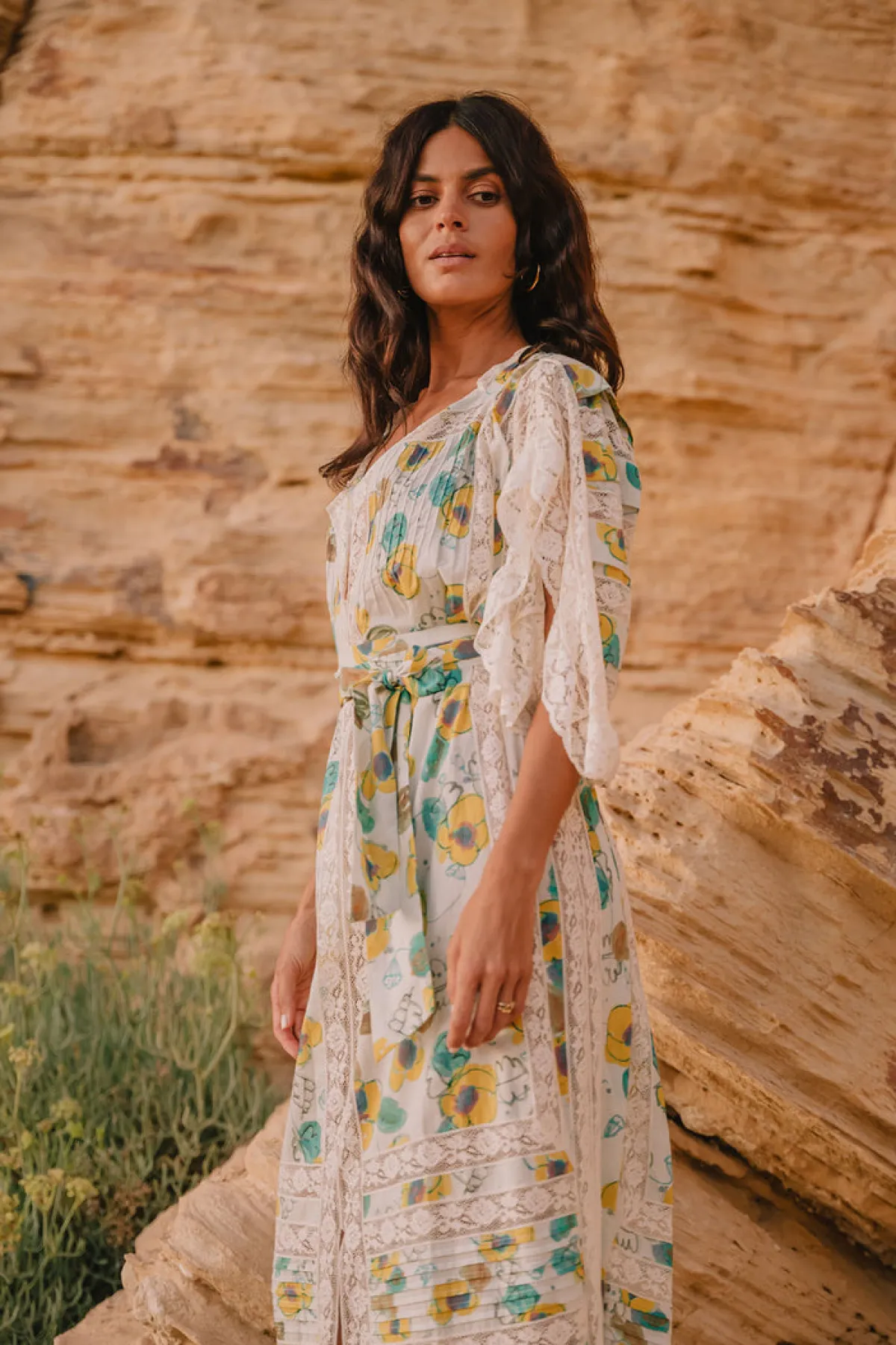 Loose cut coming into a full-volume skirt. Slit neck with button and slit square sleeves. Lace inserts throughout. Matching belt sash. Unlined with French seams 100% Cotton Model is 1.70m and wears size O/SHand wash or Dry clean